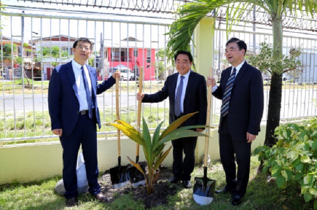 陈震宁副主任、陈蒙蒙秘书长和李少冬副主任在驻地共植椰子树,希望医疗队扎根圭亚那,服务圭亚那人民健康