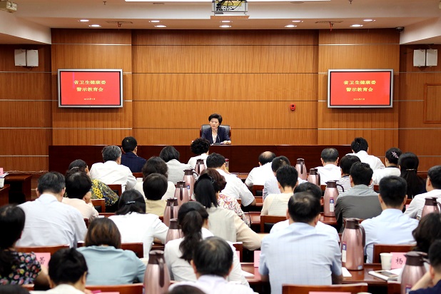 根据省委“不忘初心、牢记使命”主题教育部署要求和省卫生健康委主题教育计划安排,7月26日省卫生健康委在处以上干部中开展“自警自省、拒腐防变”警示教育,通过剖析违纪违法典型案件,引导全体党员干部在知敬畏、明底线、受警醒中进一步坚定守卫人民健康的初心使命。省卫生健康委党组书记、主任谭颖主持会议并讲话,委党组成员、驻委纪检监察组组长骆凤琴,委党组成员、副主任兰青、李少冬,委党组成员、副主任、省中医药管理局局长朱岷,委党组成员、副主任周明浩,委副巡视员邱泽森、管皎、祁爱平出席会议。