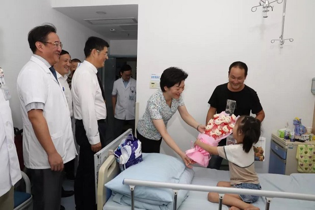 通气会后,谭颖、兰青、李少冬等委领导现场调研了南医大二附院“互联网+医疗健康”服务开展情况,并看望了正在南医大二附院进行治疗的低收入家庭先天性心脏病患儿。