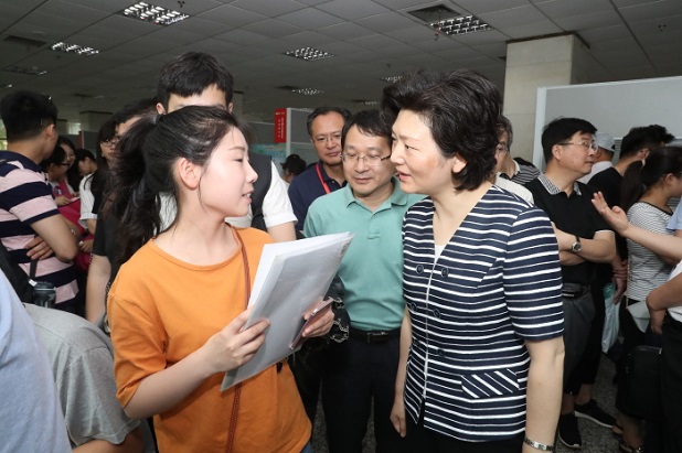 6月3日,由省卫生计生委、省人社厅联合举办的基层卫生人才招聘会在江苏省人才市场举行。省卫生计生委主任谭颖、副主任李少冬,省人社厅副厅长刘德民等视察招聘会现场。